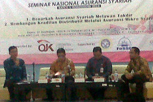 Alasannnya? “Masyarakat Indonesia mayoritasnya memang muslim, tapi yang perlu diingat adalah 90 persen dari masyarakat muslim itu ada di level menengah bawah, bukan menengah atas. Kalau mereka punya duit lebih, mereka tidak akan mengasuransikan aset berharga yang dimiliki, tetapi lebih memilih untuk mengikuti asuransi yang bisa melindungi mereka dari berbagai musibah seperti kematian, kecelakaan, kebakaran dan sebagainya,” kata Muchlasin yang tampil menjadi pembicara kedua dengan materi ‘Kebijakan Pemerintah Terhadap Industri Keuangan Syariah Non Bank.