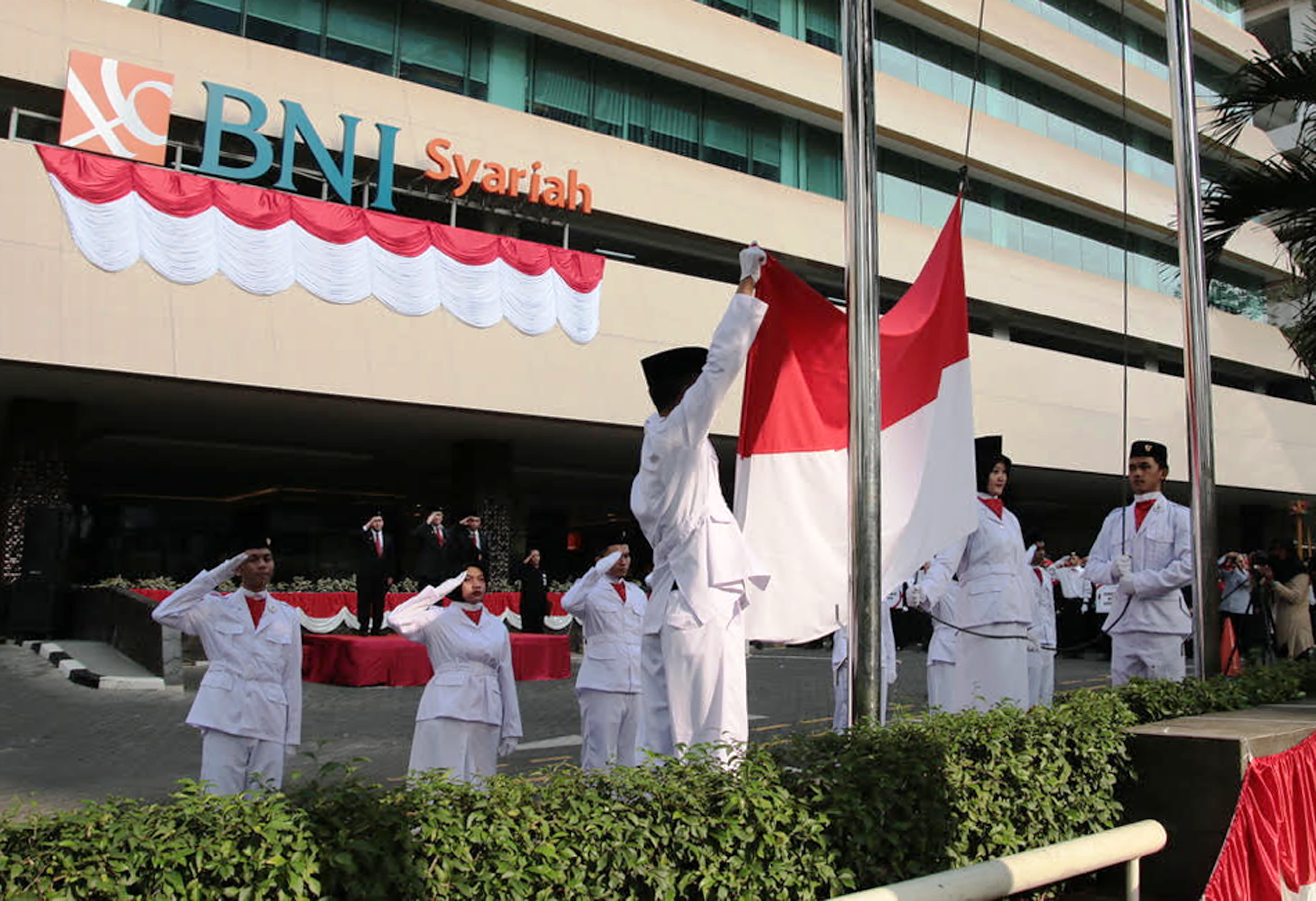 BNI Syariah menyelenggarakan upaca bendera dalam rangka HUT RI ke 70 tahun di pelataran kantor pusatnya di bilangan Kuningan, kemarin (17/8/2015).