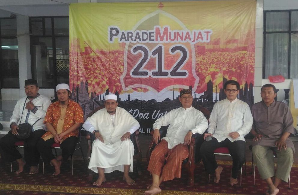 Ketua Ketua Parade Munajat 212, Ustadz Edy Mulyadi (kedua dari kiri) saat konferensi pers Deklaasi Parade Munajat 212 di Masjid Al Ittihad, Tebet, Jakarta, Jumat (14/7).foto:dok alumni 212.