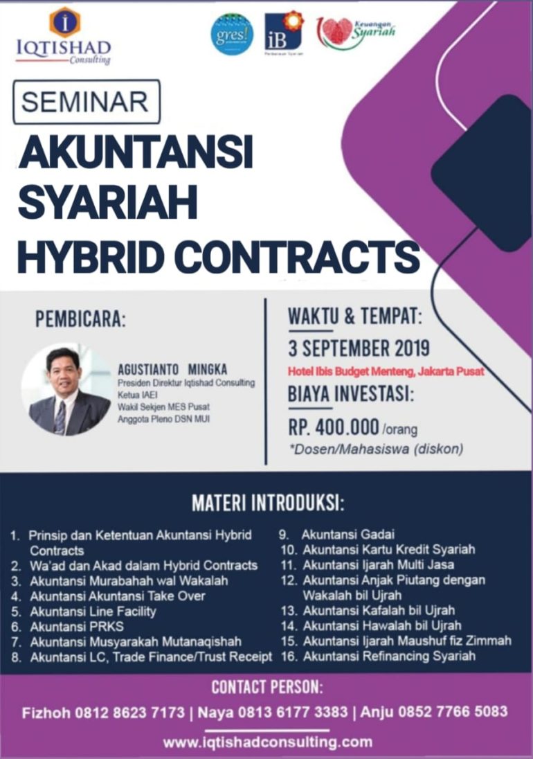 Sehubungan dengan urgennya akuntansi hybrid contracts, Iqtishad Consulting menggelar Training dan Sertifikasi Akuntansi Syariah Hybrid Contracts Level 6 pada: