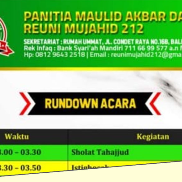Keumatan, kemanusiaan, dan kebangsaan. Acara dimulai sejak dini hari. Berikut jadwal lengkapnya yang diperoleh dari panitia Reuni Akbar Mujahid 212,2...