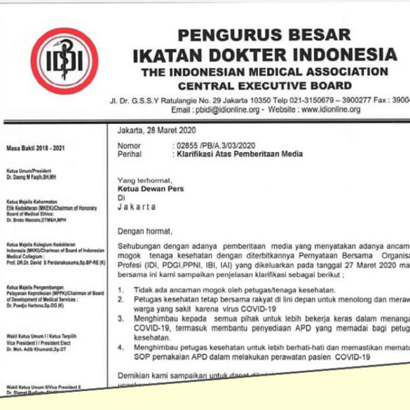 Ikatan Dokter Indonesia (IDI) mengklarifikasi bahwa pernyataan bersama sebelumnya bukanlah ancaman. Klarifikasi itu disampaikan kepada Ketua Dewan Pers melalui surat...